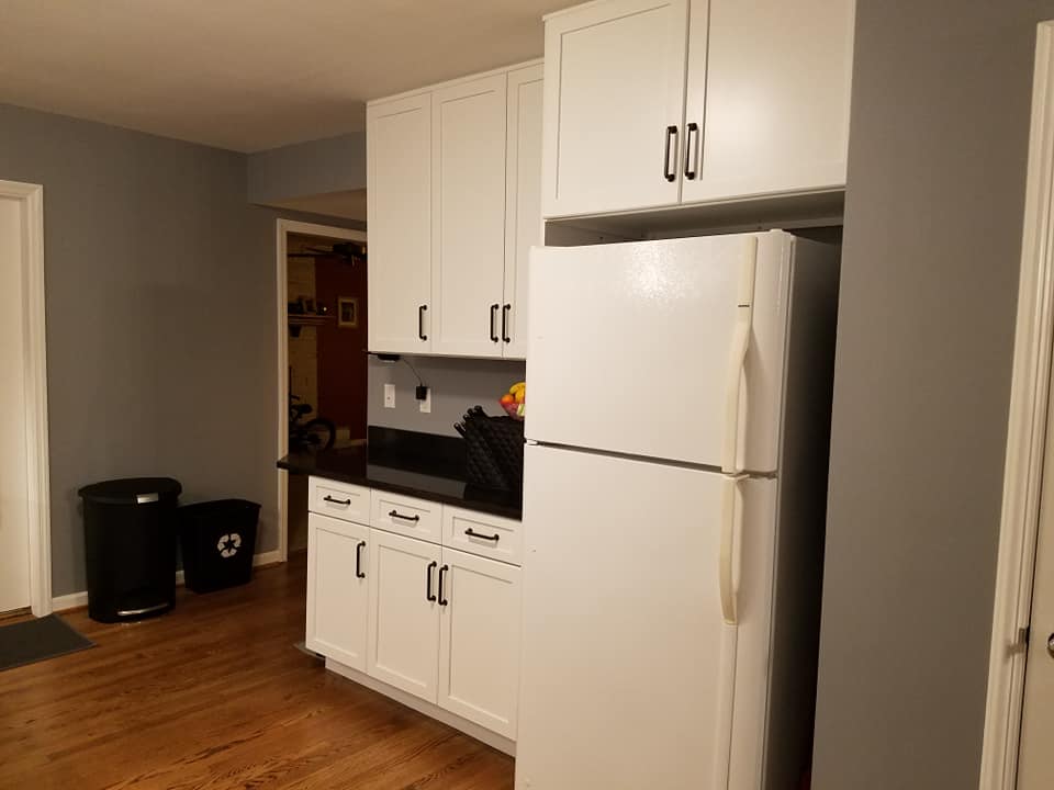 Here are some before and after photos of the kitchen. Note that I have already removed the doors on the old cabinets to keep the hardware and there is 1 missing drawer front as I measured wrong and had to resize it.