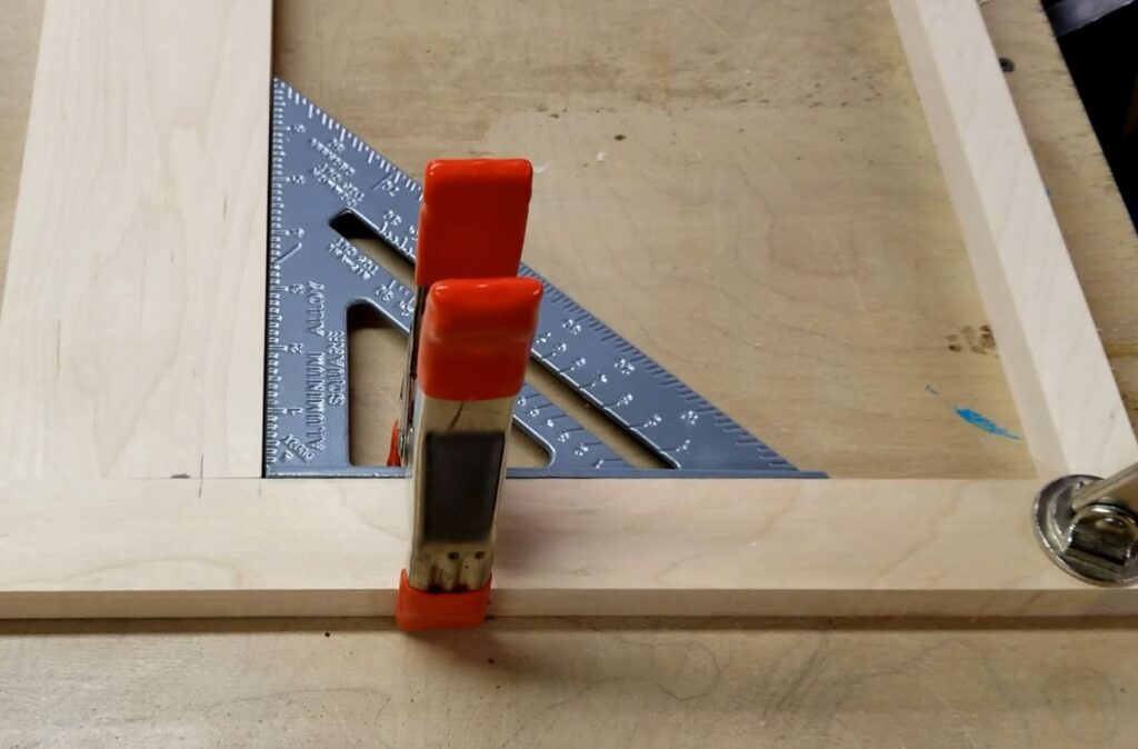 I’m squaring up a large frame by racking it a little using a pipe clamp. This causes the frame to move back into square by pulling the long side back even with the short side.